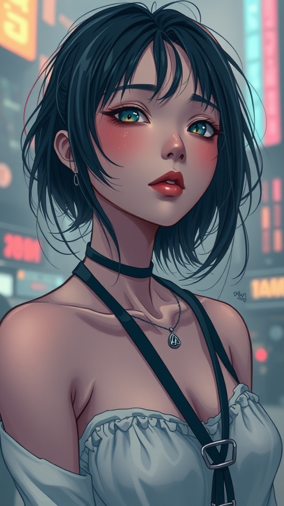 Portrait of a woman in the style of anime Ghibli by Akihiko Yoshida, set in a cyberpunk, synthwave, sci-fi world, featuring soft lighting and finely detailed features. The artwork is perfect and highly detailed with an elegant low-resolution finish. It includes intentional elements like text errors, missing or extra digits, cropped sections, and digital imperfections such as jpeg artifacts. The composition includes purposeful flaws like bad anatomy, extra limbs, and poorly drawn hands and feet. The image is out of frame with tiling and exhibits characteristics of deformed or mutated subjects, resulting in a blurry, fuzzy appearance. Watermarks and signature elements might be present, contributing to the overall aesthetic.