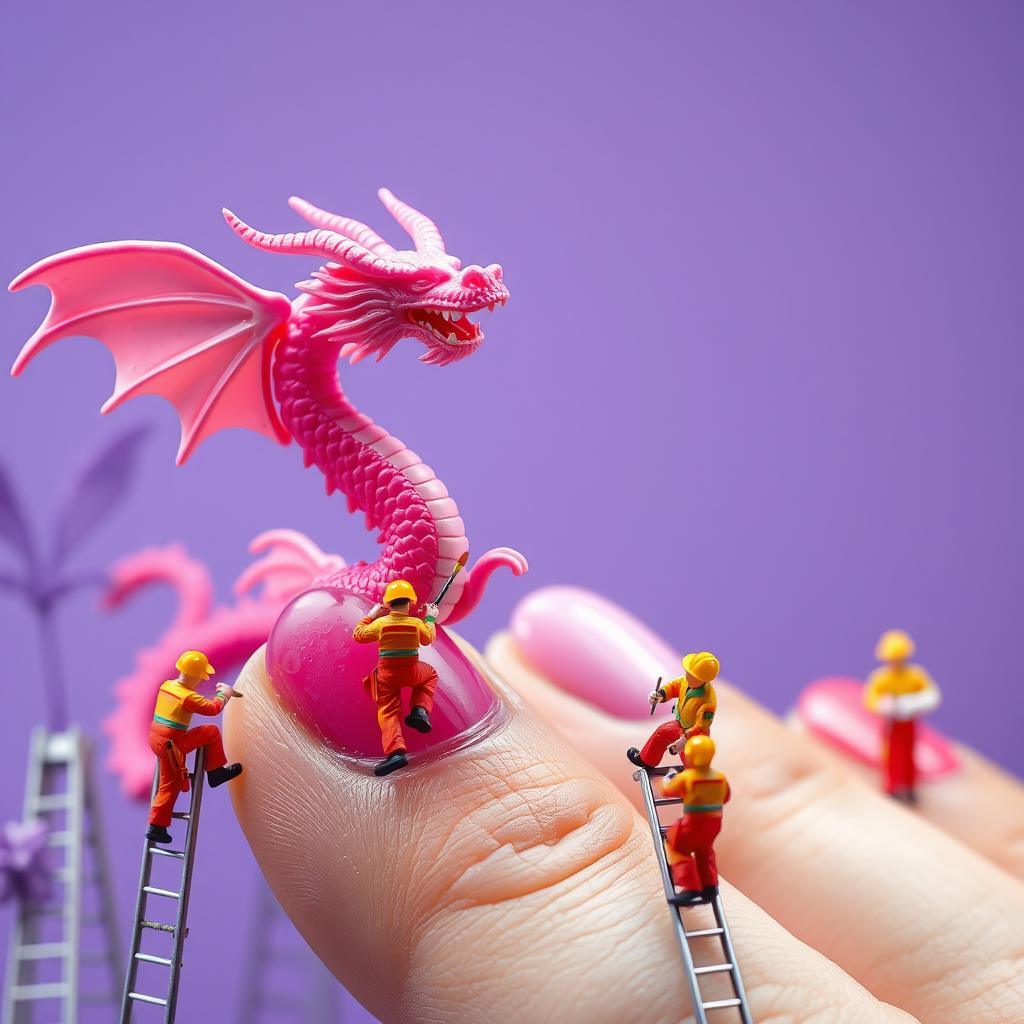 Tiny miniature workers in brightly colored uniforms are meticulously painting and drawing an enchanting ombre pink dragon onto fingernails, wielding oversized paint brushes. Others are polishing the nails with delicate cloths. They are positioned on tiny ladders and platforms, working with precision like skilled artisans restoring a grand monument. In the background, a vivid lavender hue adds a striking contrast, enhancing the scene's surreal yet photorealistic quality. The setting captures a whimsical, professional aesthetic with cinematic depth and ultra-detailed textures, embodying an imaginative and delightful atmosphere.