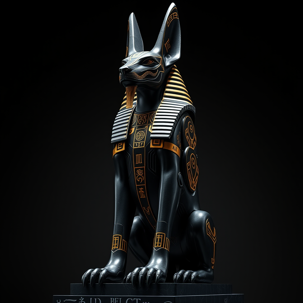 A masterful sculpture of Anubis "God of Death" emerges in a futuristic reinterpretation, embodying an avant-Egyptian aesthetic. The monumental figure, complex and futuristic, is sculpted from ultra-smooth black granite with gold inlays, featuring modular, sacred hieroglyphs. It stands against a dark backdrop illuminated by softly projected Egyptian symbology in light. The portrait shot captures its grandeur and soberness, with a central focus on its laser-cut, hyper-detailed design. The style is a fusion of sci-fi and futuristic avant-Egyptian elements, showcasing a unique reinterpretation of this divine figure.