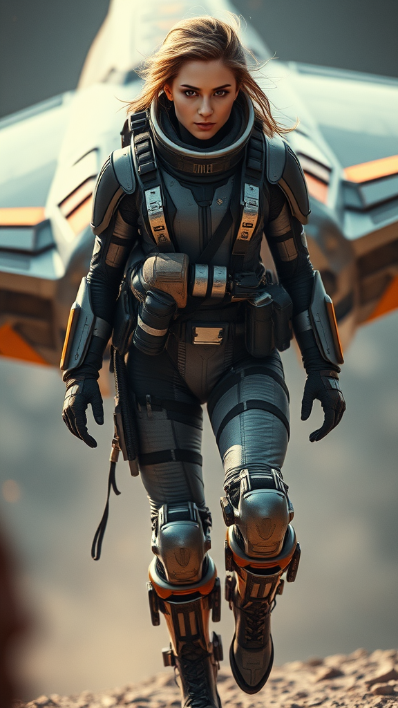 A skilled female X-wing pilot dons a sleek, futuristic space suit with reinforced boots, embodying a blend of epic fantasy and hyper-realistic design. Her suit features intricate detailing that underscores its warcore aesthetic, with hints of metallic hues reflecting the harsh lighting of a cinematic environment. Her expression is one of steely determination, conveying both strength and agility, while the grainy texture adds depth to the graphic quality of the scene. Set against the vast backdrop of space, her presence is commanding and fierce, capturing the essence of dynamic interstellar warfare in stunning 8k detail.