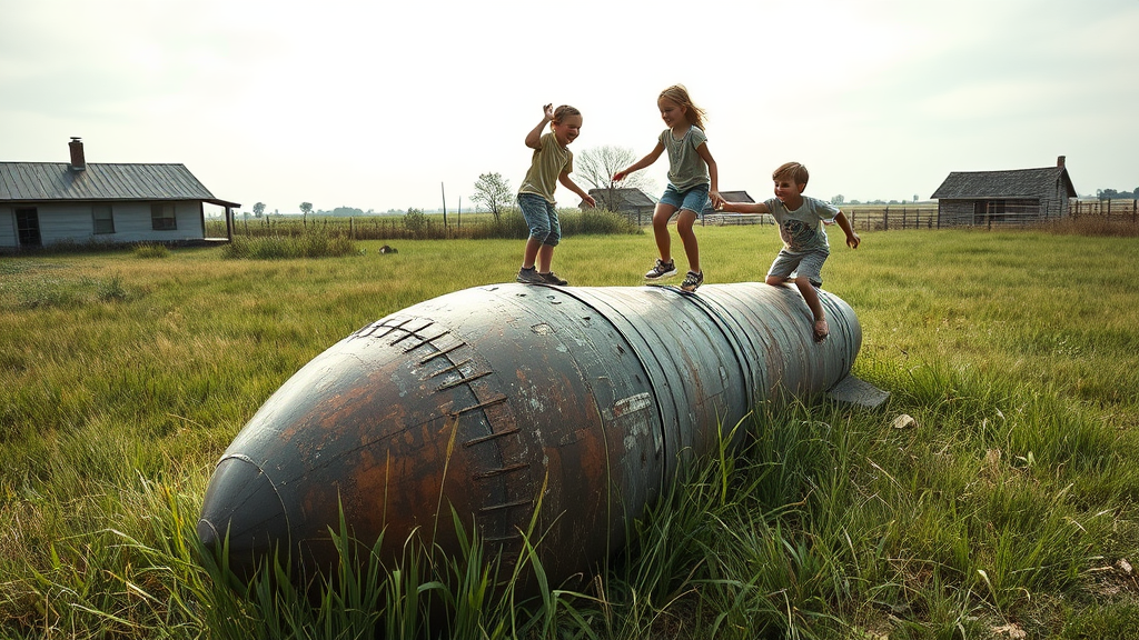 An ancient, corroding missile embedded deep into the grassy expanse of a remote rural front yard, its surface slowly becoming one with nature. Children, unfazed by the relic's potential, climb and play on it, their laughter echoing through the serene landscape. The setting is painted with a photo-realistic attention to detail and an ethereal fantasy aura, as if lifted from a dream. The scene captures elements of zen simplicity and contemplative calm, reminiscent of Die Brücke's bold, emotive expressions. The landscape unfolds as a fictional dreamscape, a surreal blend of reality and imagination, where the missile becomes a forgotten piece of history entwined with the peaceful rhythm of nature.