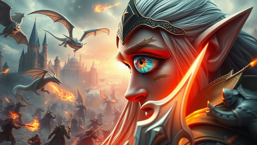 An epic poster-style photograph inspired by the Warcraft universe, showcasing a hyper-realistic portrait of a valiant elf hero clad in intricately detailed, gleaming armor, standing resolute amidst the chaos of a grand battlefield. Mythical creatures clash in a whirlwind of action, with powerful magic casting vibrant hues across the scene. The central element is the elf's piercing eye, which serves as a lens into the tumultuous world, reflecting dazzling images of towering castles, majestic dragons soaring against a stormy sky, and fierce warriors locked in combat. The eye captures the essence of this epic confrontation, blending the raw energy of battle with the serene focus of the hero, offering a mesmerizing glimpse into a realm of fantasy and valor. Subtle creative touches enhance the scene, such as the shimmering aura emanating from the hero's sword, casting an ethereal glow that contrasts with the dark encroaching shadows of the battlefield.
