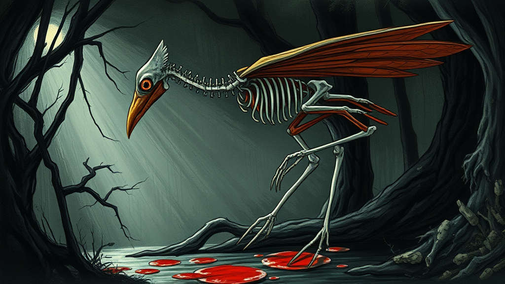 Venus flycatcher of bone-eating creatures sketch drawing storybook illustration moody lighting capillary graphics stylized spine ribs joints bones skeletal form thick red water puddles eerie atmosphere elongated limbs muted tones textured layers chiaroscuro effect hauntingly beautiful visual organic elements surreal forest intertwining branches mystical landscape ethereal glow dark undertones captivating scene