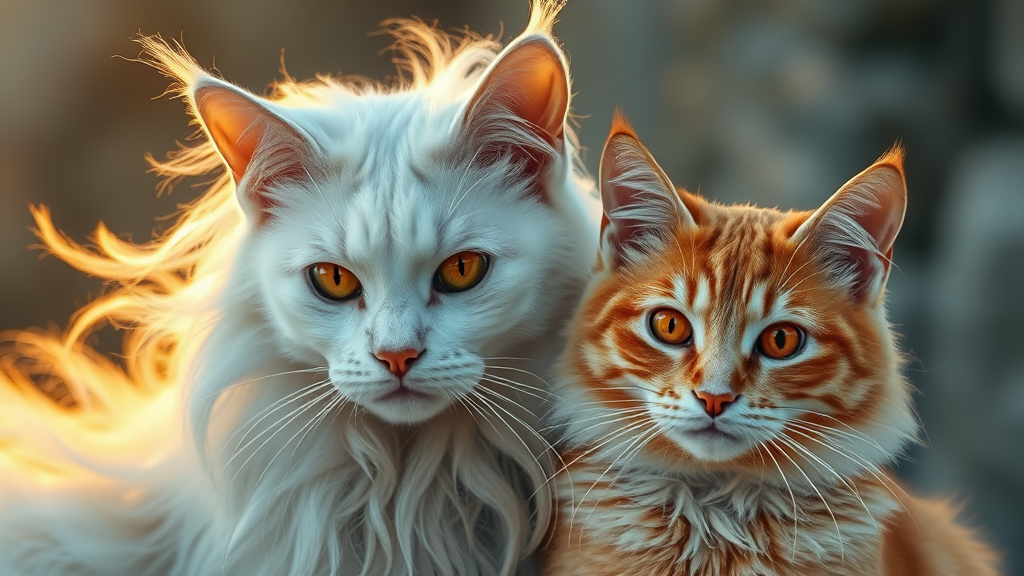 Photographic portrait of an ethereal white cat sorceress, her flowing silvery-blonde mane shimmering like moonlit silk, eyes the color of golden amber, capturing the warm glow of the setting sun, gracefully presiding in her mystical realm alongside her enchanting companion, a captivating ginger cat with fiery crimson eyes, intense and commanding like a blazing inferno, a striking contrast amidst their shared monochromatic fur attire. Digital rendering, high-definition, emphasizing intricate fur detail, bathed in soft ambient light, with dramatic volumetric lighting to enhance depth and presence.
