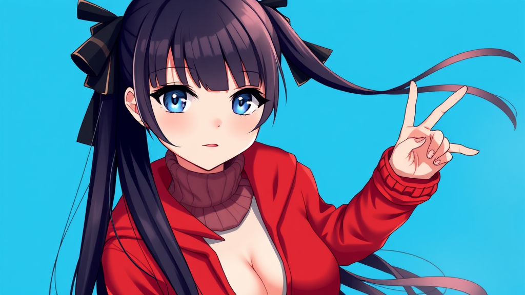 1girl, solo, flowing long hair, red hoodie, revealing midriff, intensely gazing at viewer, vibrant blue background, sleek black hair, minimalist backdrop, delicate fingers, inviting lips, stylish ribbon, hair adorned with ribbon, fringe framing face, snug turtleneck sweater, focused upper body composition, partially tied up hairstyle, distinctive turtleneck, striking blue eyes beneath bangs, elegant black hair ribbon, textured ribbed hoodie, playful twintails, defined nose, crisp 3D appearance, free of blemishes or imperfections.