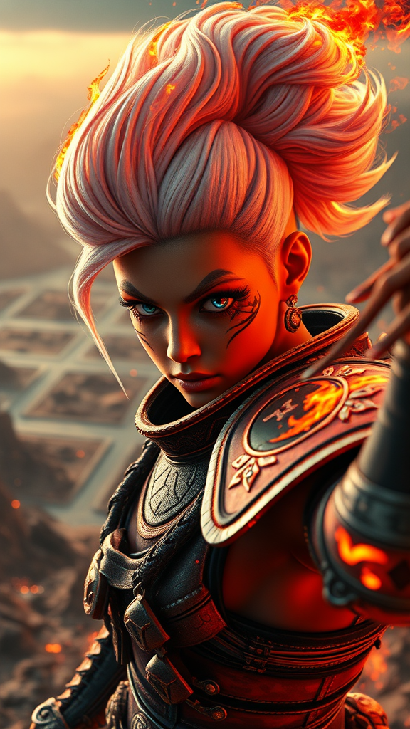 Masterpiece, best quality, realistic, colorful cinematic lighting, photo of a fire warrior with white hair in an updo, featuring captivating eyes, Shas Warrior from Warhammer 40k, fanart style, with vivid details and vibrant colors. The background showcases a landscape of an alien planet with a detailed panorama. The warrior strikes a dynamic pose with an aggressive demeanor, exhibiting a complex and intricate design. Shot with RTX technology, the scene has a sci-fi essence, captured through a 50mm prime lens at F/2.8 aperture. The image is hyper-realistic with lifelike textures, providing a photorealistic experience at 8k resolution. Sharp focus is achieved using Unreal Engine and enhanced by ENB, resembling the aesthetic of Cinestill 800 film. The portrayal avoids distorted anatomy, maintaining correct and appealing proportions.