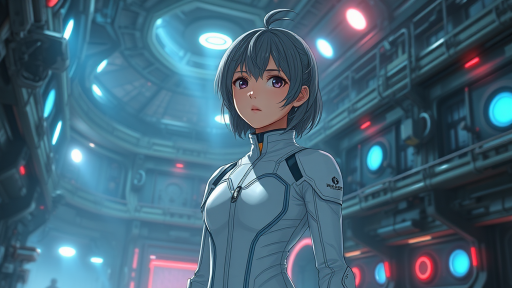 A Tsutomu Nihei-inspired scene featuring a young girl in a white, tight sci-fi jumpsuit, set in a complex cyberpunk universe. Her hair, slightly tousled, blends futuristic style with anime influences as she stands in the interior of a vast spaceship. The atmosphere is chilly, with muted colors and a cold, gloomy look. Blue and bright lumens from specific angles illuminate her, highlighting the intricate details and sharp angles of the multi-storey space around her. The room is filled with sharp shadows and a blurred background, embodying a hyper-detailed, futuristic aesthetic. Clumps of energy and flashes of light add dynamism to this third-person portrait scene, with round illumination creating focal points. The design includes round elements and red accents, with an emphasis on imaginative sci-fi features. There are occasional distortions, with elements suggesting deformed or mutated forms, invoking a sense of disfigurement or cloning. These abstractions blend with the otherwise sleek and polished environment, hinting at the imperfections and anomalies that coexist within this high-tech world.