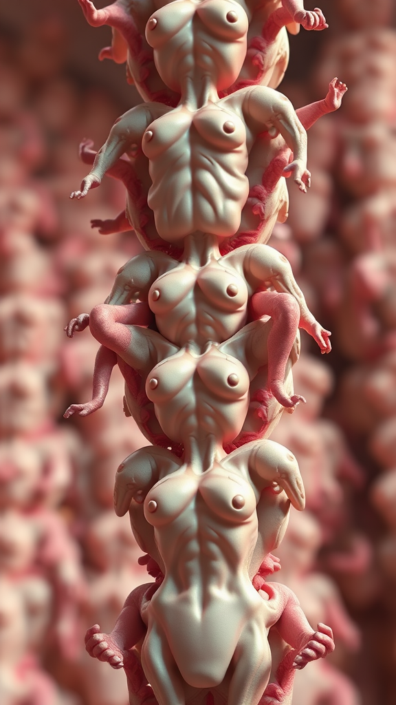 Pixar-inspired, pastel color palette, emphasizing natural and realistic lighting and shading, featuring a dynamic pose with high-quality ultra detail in a 3D render. Utilizing C4D and Octane Render with ray tracing for an 8k resolution visual. Complex composition of stacked torsos resembling a totem pole, exhibiting abstract and surreal anatomical forms with creative deviations, like extra or missing limbs, and floating, disconnected parts. Elements of mutation and exaggerated features create an unsettling yet fascinating aesthetic, blending beauty with grotesque in a blurred, dream-like spectacle.