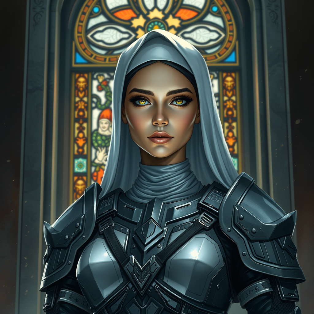 A majestic full-body portrait of a devoted Sister of Battle stands prominently before a grand stained glass window. The scene captures her in an action pose, highlighting her intricately detailed symmetrical face with reflective eyes and dark eyebrows, enhanced with subtle makeup. She is adorned in sci-fi nun armor, expertly drawn in the Warhammer 40k style. The setting features marble walls with dust particles dancing in the air, illuminated by detailed rim and dramatic chiaroscuro lighting from above. The composition reflects the professional majestic impressionism of artists like Waterhouse, John Constable, and modern talents such as Atey Ghailan, resembling the magical depth of Studio Ghibli. The painting conveys intricate, high-detail artistry, reminiscent of Makoto Shinkai's Kyoto scenes, and is trending on platforms like ArtStation and CGSociety. The atmosphere is one of sophistication and dynamic presence in a blend of various artistic influences.