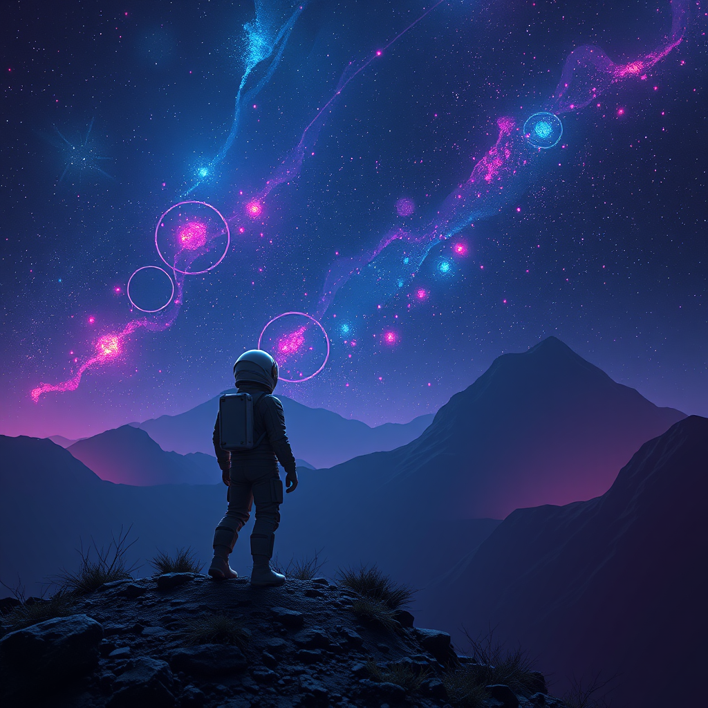 A solitary figure in a space suit stands atop a hill, gazing dreamily into the depths of a dark neon-colored universe. The scene is a vibrant, realistic illustration with the essence of metal album cover art, evoking a sense of dreaming about the cosmos. Inspired by interstellar film aesthetics, the digital artwork features volumetric lighting and stunning CGI effects, rendered with the precision of Octane. The scene feels almost surreal, with some elements subtly distorted like an abstract 3D sculpture. There are peculiar details such as missing or extra digits, and visible jpeg artifacts. This evokes an atmosphere of haunting beauty, where imperfections blur the lines between dream and reality, enhanced by fuzzy edges and bizarre, mutated shapes. The overall composition is intriguing, with slight anomalies lending an unsettling yet captivating touch.