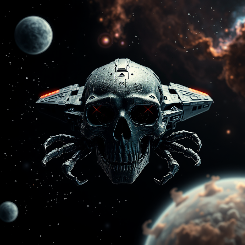 A highly detailed, hyper-realistic sci-fi spaceship in the shape of a skull, soaring through space with a black background. The scene is illuminated by distant stars and vibrant nebula clouds, emphasizing a futuristic design with sharp focus. The use of advanced ray tracing techniques gives the imagery a cinematic feel, captured in stunning 16k UHD HDR quality. The spacecraft has intriguing features like a cloned face, crossed eyes, and mutated hands with extra fingers, giving it an otherworldly appearance. Avoiding common flaws such as appearing cropped, low resolution, or having any text, artifacts, or watermarks. The composition remains contained within the frame with no extended necks or out-of-frame elements.