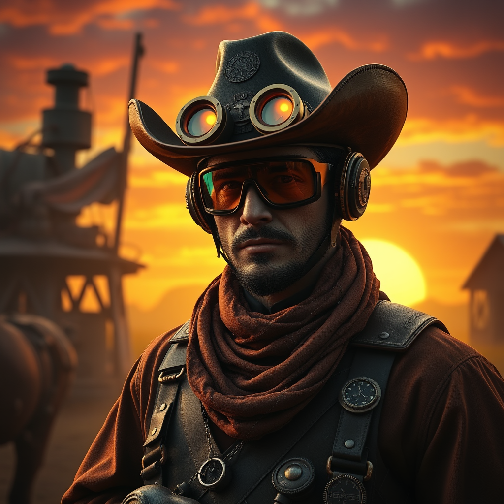 Realistic cowboy steampunk scene with warm autumnal colors, capturing an intricate blend of vintage wild west and futuristic machinery. The ultra hd, high detailed depiction reveals a heroic cowboy sporting steampunk goggles and gear, set against a vividly atmospheric sunset backdrop. The digital art showcases glow effects and striking visual elements, rendered with an exquisite touch in Cinema 4D and Blender. With dark, atmospheric tones, the focus is sharp, emphasizing the rich textures and shadows, adding a touch of humor and charm. The masterpiece evokes the artistic flair of Ed Blinkey, Atey Ghailan, Jeremy Mann, Greg Manchess, and Antonio Moro. The scene pulsates with vivid colors and dramatic lighting, reflecting the depth and sharpness of a high-resolution model shoot, drawing inspiration from trending concepts on ArtStation and CGSociety. Elements of steampunk machinery nestled amongst rugged western landscapes merge to form a photorealistic painting, hinting at the creativity of midjourney and Greg Rutkowski. The composition is UHD, HDR, 8K, with a unique and mesmerizing Dark Sushi Mix Colorful twist.