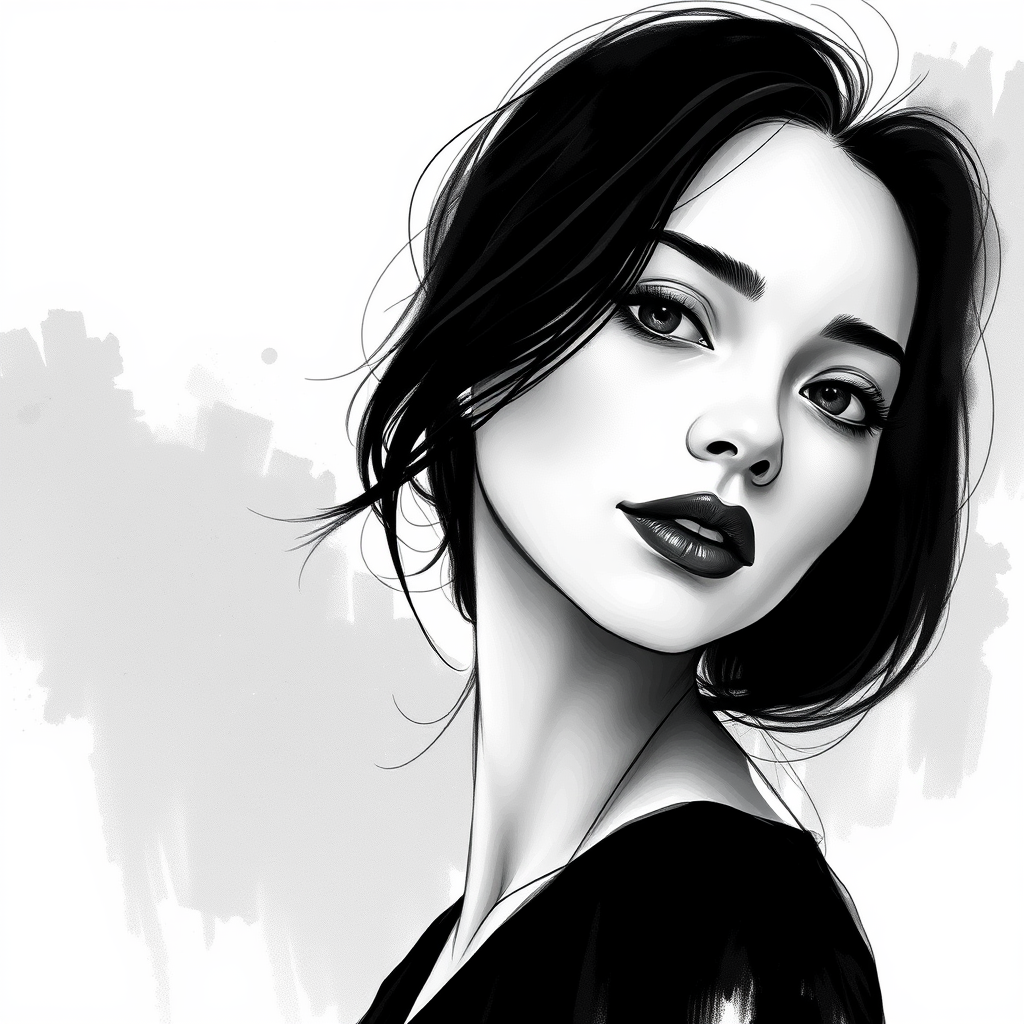An illustration of a woman in black and white, exuding an effortless chic elegance, her serene face reminiscent of Mario Testino's fashion portraits. The composition features subtle blink-and-you-miss-it details, blending the delicate brushwork of Xu Beihong with the surreal yet sophisticated touch of Chris Labrooy. The elongated vertical aspect ratio draws the eye upwards, enhancing the graceful aura of the figure, framed within an abstract, minimalistic background.