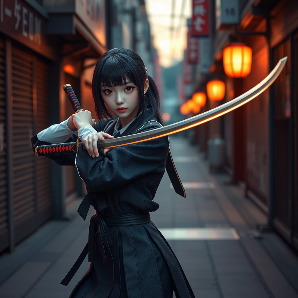 A charming Japanese female sophomore in a school uniform gracefully wielding a katana in an atmospheric alleyway at dusk, rendered in a cinematic 3D style using unreal engine, highly detailed with 32k resolution, showcasing an expressive and dynamic pose against the urban backdrop, --ar 9:16 --style vibrant --s 175.