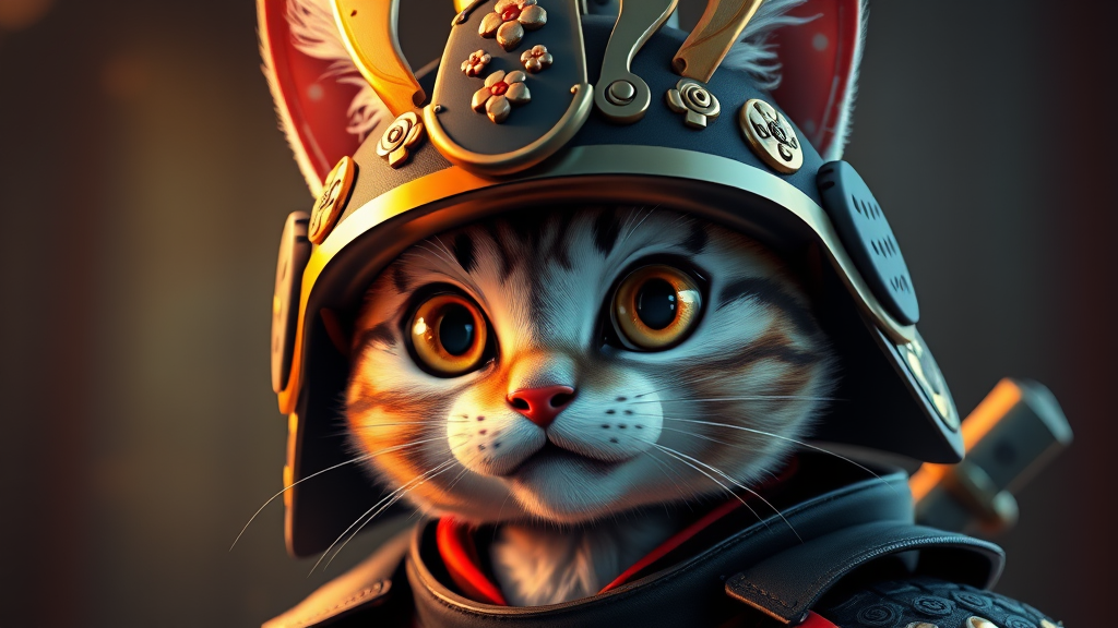 A detailed 3D render of a whimsical cat dressed as a samurai, featuring a sleek, intricately designed helmet adorned with subtle floral patterns. The cat's bright, expressive eyes peek out with a mischievous sparkle, while its fur, rendered in vibrant shades, adds to the adorable yet noble appearance. The scene captures the essence of a mythical feline warrior, blending cute charm with an aura of ancient bravery. The helmet's glossy finish reflects soft ambient light, enhancing the overall enchanting atmosphere.