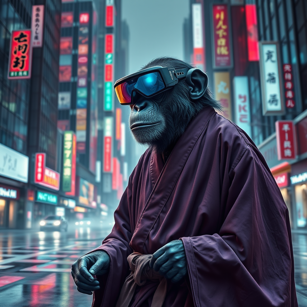 A hyper-realistic masterpiece of a chimpanzee yakuza adorned in futuristic sci-fi augmented reality goggles and elegant zen robes, navigating through a mystical cyberpunk city street. The city's neon signs reflect off the glossy surfaces of towering skyscrapers, casting a spectrum of colors on the wet pavement. The chimpanzee exudes an air of authority and calm, blending seamlessly into the bustling urban landscape where tradition meets technology.