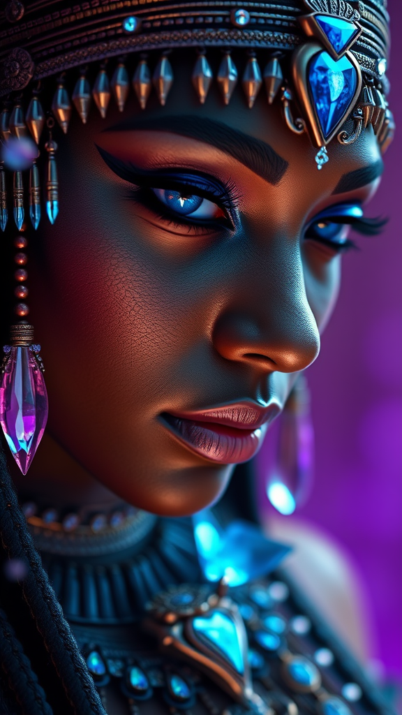 Close-up portrait of a Nubian queen captured as an ancient Egyptian Wonder Woman, wearing an intricate black panther pendant in ice-blue hues. Her detailed garment boasts bioluminescent colors, and is set against cinematic lighting. The scene sparkles with a metal diamond design rose, adorned with droplets of crystal and icicle-like gems. The palette is enhanced with cinematic shades of purple and soft bokeh effects. The visual is 8K quality, showcasing immense intricate detail, creating a photorealistic and stunning image.