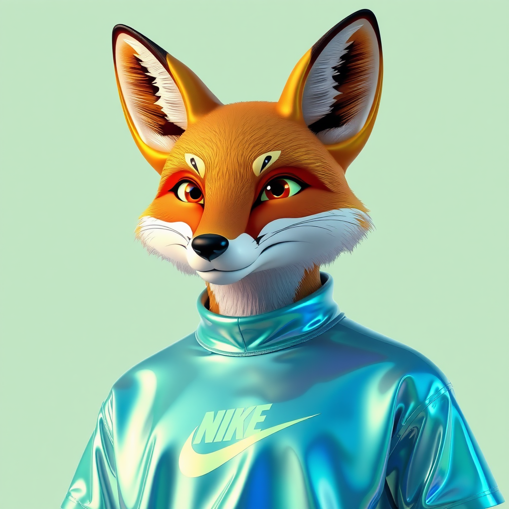 A 3D cartoon fox head with a human body, adorned in an iridescent holographic liquid texture and translucent sun-protective shirt with a boss-like aura. The shirt, either Nike or Adidas, exudes sun protection and complements the WitchPunk Y2K style. The ensemble features a color scheme of green and blue with a metallic feel and strong reflection. Set against a pure single-color background, this piece embodies digital fashion and surreal futurism with a nod to Supreme Kong NFT artwork style. It captures the essence of Disney and headshot photography in a fashion editorial context, rendered in high resolution akin to the HAPE PRIME NFT and Bored Ape Yacht Club NFT projects. This highly detailed, fine-luster 3D render showcases bright front lighting for an ultra-detailed portrait.