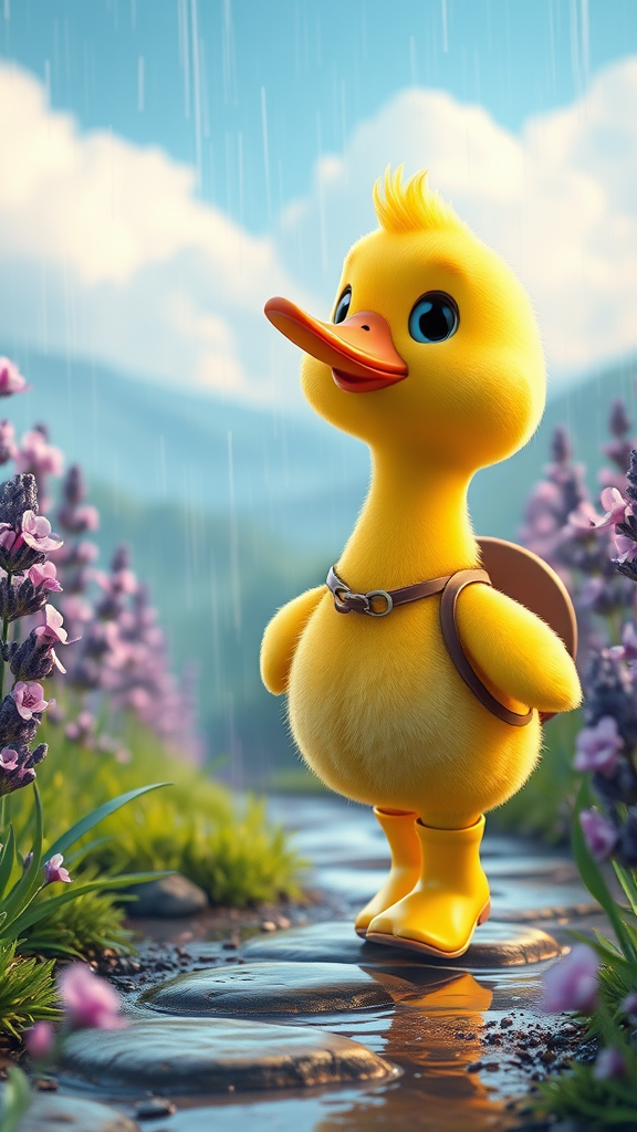 whimsical enchanting character design 3d octane render wide shot, chibi irresistibly cute little duck embarking on a journey in a gentle rain, stunning landscape, lavender blossoms, vibrant spring atmosphere, bright yellow rain boots, expressive big eyes, world-class, hypermaximalist, octane render, cinematic illumination, richly detailed scenery, lush greenery, dreamlike, playful mood