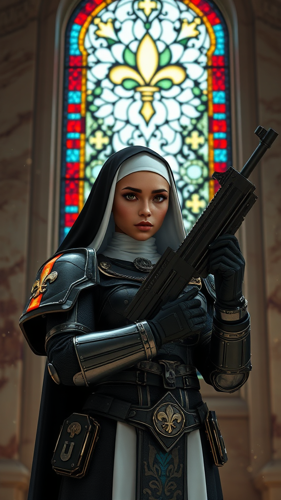 Full body shot of an enchanting sister of battle with tanned skin and a distinctive fleur de lys face tattoo, holding a bolt rifle with an air of authority. She stands poised before a mesmerizing stained glass window, her sci-fi nun armor adorned with wax seals, displaying intricate and high-detail design influenced by Warhammer 40k style. Her symmetrical face, dark eyebrows, and artfully applied mascara complement her reflective eyes. The surroundings boast marble walls where dust particles dance in the air, illuminated by a play of dramatic, chiaroscuro lighting. The ambiance is reminiscent of a professional and majestic impressionism oil painting, akin to the works of Waterhouse, John Constable, Ed Blinkey, Atey Ghailan, and others. This piece is inspired by trending artworks on ArtStation and CGSociety, capturing a detailed, dramatic style that echoes the cinematic beauty of Studio Ghibli and Makoto Shinkai.