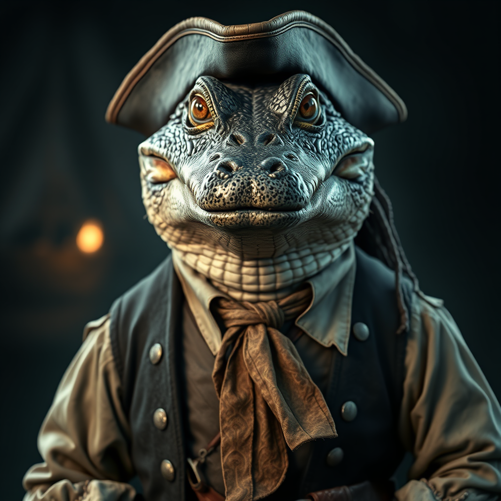 Realistic portrayal of an anthropomorphic alligator dressed in 18th century pirate attire, featuring a weathered neck tie, designed as a compelling video game character, set in a cinematic world with realistic, highly detailed features. The portrait is in HD and 4K quality, capturing the essence of HBO's dramatic storytelling with moody, cinematic lighting and dark, rich colors that convey an adventurous yet mysterious atmosphere. This character embodies the untamed spirit of the sea, with piercing eyes and a rugged demeanor that tell tales of countless voyages and buried treasures.