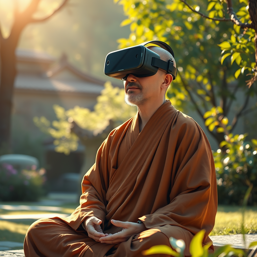 A zen monk meditates peacefully in a serene garden, wearing traditional zen robes and a VR headset, the sunlight casting a warm glow on his tranquil face. The scene is painted in an exquisite 8k, masterpiece style, blending the intricate, highly detailed techniques of Greg Rutowski with the expressive, dynamic elements of Yoshitoshi and the enchanting, whimsical touches of Studio Ghibli. The dramatic cinematic lighting enhances the photo-realistic oil painting, capturing the harmony between ancient mindfulness and modern technology, all while avoiding the perplexing distortions of bad-hands-5 and the uninspired elements of paintings by bad-artist.