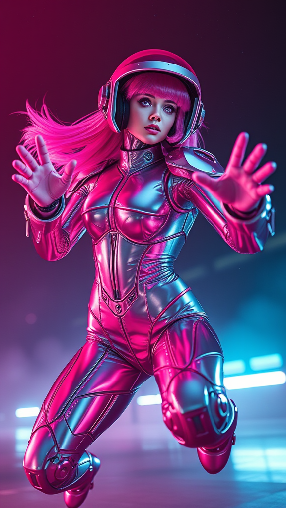 A high-resolution image reveals a dynamic character in a futuristic setting. This shining AI, her face human-like, is clad in a sleek metal suit and a helmet. She strikes an energetic pose, her flowing garments suggesting motion. The vivid color scheme of pink and reflective silvers echoes nightcore aesthetics, with dramatic backlighting creating a neon glow against the cosmic, dark hues of the backdrop. She is bright and intriguing, with sharp focus on her form and a blurred background. The realistic textures of her clothing and hair are detailed, and a visible light source in her hands emits a gleaming, otherworldly effect. Her purple eyes are striking, and her entire form is poised in a leaping gesture, reaching out with a gaze fixed above. Captured as if by a GoPro HERO10 Black, or in the cinematic tones of Cinestill 800T, this cyberpunk-inspired scene unfolds like a candid snapshot, freezing a spontaneous moment of action in a surreal, sci-fi universe.