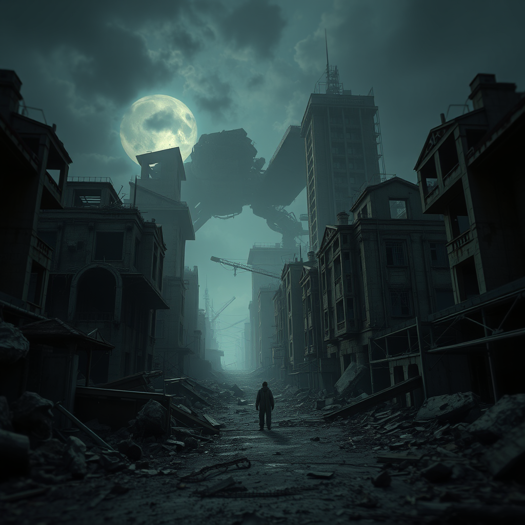 End of the world, epic and realistic atmosphere, apocalypse setting with abandoned buildings, dominated by neutral colors in the night. Enhanced by screen space refractions, cinematic artstation-style shot with a vignette effect. A complex background showcasing crumbling structures, devoid of life yet hauntingly beautiful. Free from poorly drawn elements, maintaining correct anatomy, with limbs well-integrated into the scene. Avoids any mutations or grotesque figures, maintaining clarity and coherence in this desolate yet visually captivating world.