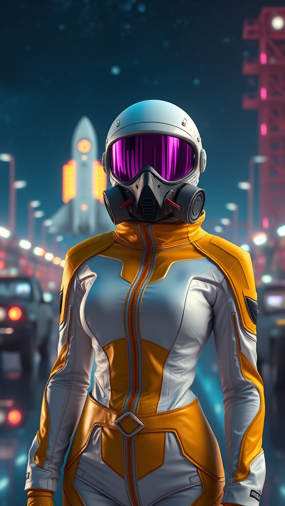 A woman in a sleek white and yellow intricately detailed jumpsuit stands in a bustling spaceport, a majestic spacecraft launching in the background. She wears a mask with a purple sci-fi visor and an advanced sci-fi respirator. The scene is reminiscent of trending artstation pieces, characterized by extreme detail, cinematic composition, and a captivating environment. The shiny, smooth surfaces give a surreal, celestial feel, blending elements of manga and anime with a richly colored atmosphere. The cinematic lighting enhances the hyperrealistic depiction, with a focus on Unreal Engine 5’s lumen reflections, creating a stunning CGI render reminiscent of an octane-rendered doll. The scene exudes charm without the distracting flaws of low-res, errors, or poor quality, maintaining perfect anatomy and proportions within the frame.