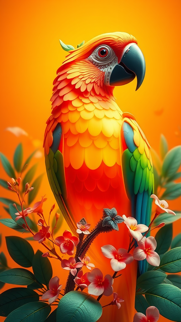 A vibrant 3D abstract parrot, its form elegantly interwoven with lush foliage and delicate flowers, emits a gentle, ambient light. The scene is set against a warm, glowing orange backdrop, enhancing the ethereal quality of the composition. Subtle variations in light and shadow bring depth to the parrot's intricate details and the surrounding botanical elements.