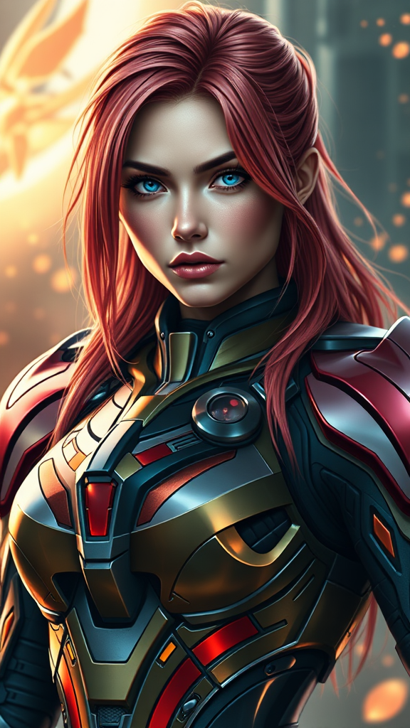 Photorealistic portrait of stunning Asuka Langley adorned in sleek sci-fi armor, showcasing intricate design and vibrant colors, set against a dynamic background that highlights her fierce and determined expression, emphasizing reflections and shadows for depth, capturing a futuristic yet timeless essence, with an aspect ratio of 16:9 and a sense of cinematic intensity.