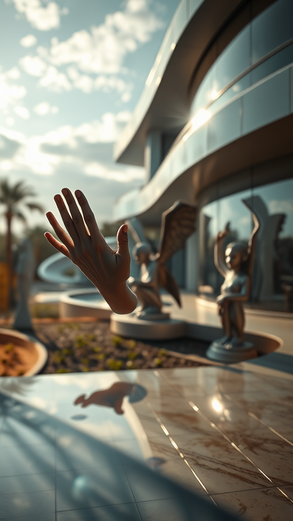 Futuristic luxury home partially visible, featuring sleek architectural lines with a mix of blurred and fuzzy elements, hands with extra fingers subtly integrated, shadows casting over disfigured statues and mutated wings, creating an abstract interplay of light and form. The landscape offers distorted reflections, enhancing a sense of surrealism and tiled textures.