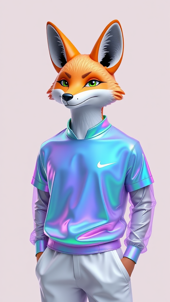 3D cartoon fox head with a human body, wearing an iridescent holographic liquid texture shirt and a translucent sun protective shirt, exuding a boss-like aura. The shirt is styled in a mix of WitchPunk and Y2K aesthetics, with distinctive Nike or Adidas branding. The color palette features green and blue with a metallic sheen and strong reflections, set against a plain, pure single color background. The style blends elements of digital fashion and surreal futurism, evoking the Supreme Kong NFT artwork style, with a Disney-inspired twist. The portrait is in the vein of a high-resolution fashion editorial shoot, reminiscent of HAPE PRIME NFT, with a nod to the Bored Ape Yacht Club NFT project. The render boasts high detail, with a fine luster and an ultra-detailed 8K resolution, highlighted by bright front lighting.