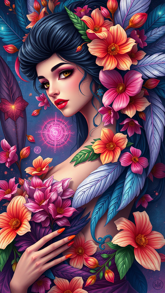 Craft a vibrant digital painting featuring a voluptuous concubine adorned with feathers and flowers, inspired by the intricate works of Ernst Haeckel and Maria Sibylla Merian. Infuse styles reminiscent of artists like Tristan Eaton, Victo Ngai, Artgerm, and Rhads, with the dynamic flair of Ross Draws and the provocative essence of Kaethe Butcher. Incorporate the futuristic allure of Hajime Sorayama, the illustrative detail of Greg Tocchini, and the ethereal beauty of Virgil Finlay. Set against a sci-fi backdrop with a riot of colors and neon lights. Capture the elegance and grace of a paper craft style through digital craftsmanship, potentially akin to the vibrant portfolios on Pixiv or the finesse of Ilya Kuvshinov. Render in 8k, UHD, HDR quality, avoiding visual noise such as low resolution, blurriness, artifacts, watermarks, logos, or text. Keep the focus sharp and the features harmoniously arranged.