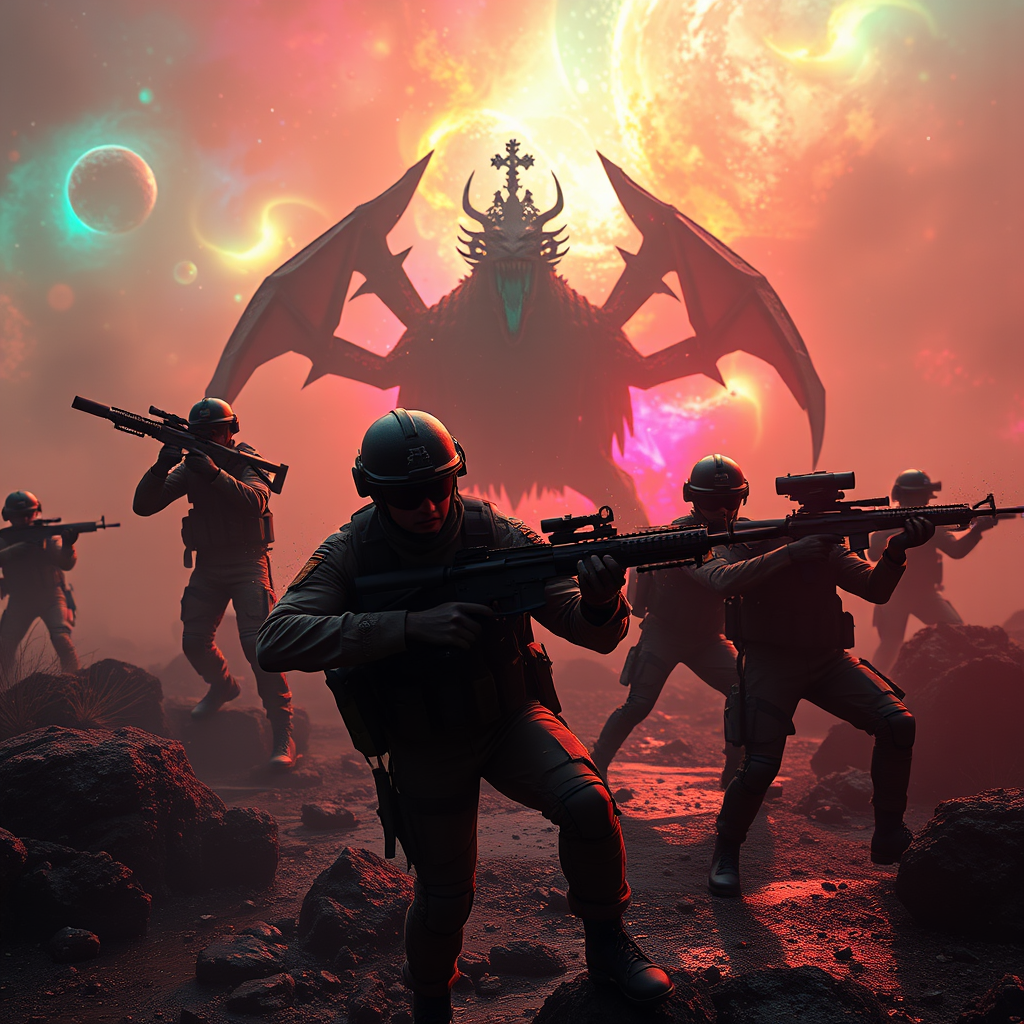 In a future where soldiers are trained in hyper-realistic virtual reality environments, a rogue virus infiltrates the system, trapping them in landscapes where simulated threats turn horrifyingly real. As the virtual realm becomes a battlefield, they encounter a cursed prince transformed into a beast amidst vibrant, multi-colored nebulae. The Nikon D3500 captures the surreal combat with intricate detail, reminiscent of Robert Capa and Alfred Stieglitz's evocative styles. As they fight for survival, the Future Circular Collider ripples across backgrounds, while thermal visions reveal hidden dangers. Set against the backdrop of a fairy-tale island lagoon, the soldiers maneuver through mystifying settings, their figures cloaked in dynamic shadows and brilliant light contrasts, akin to a sci-fi social science narrative. Photorealistic imagery comes alive with the Hasselblad X1D - 50c, revealing each hyper-detailed action pose and epic scene. The cinematic presentation utilizes volumetric lighting, creating a moody yet vibrant atmosphere. The surroundings are brought to life with natural textures and soft lighting, capturing every moment in 8K Ultra-HD with a pursuit-like intensity from Gesaffelstein's style. Each snapshot is a testament to the blend of fantasy and reality, where photography, storytelling, and cutting-edge technology converge in this thrilling saga.
