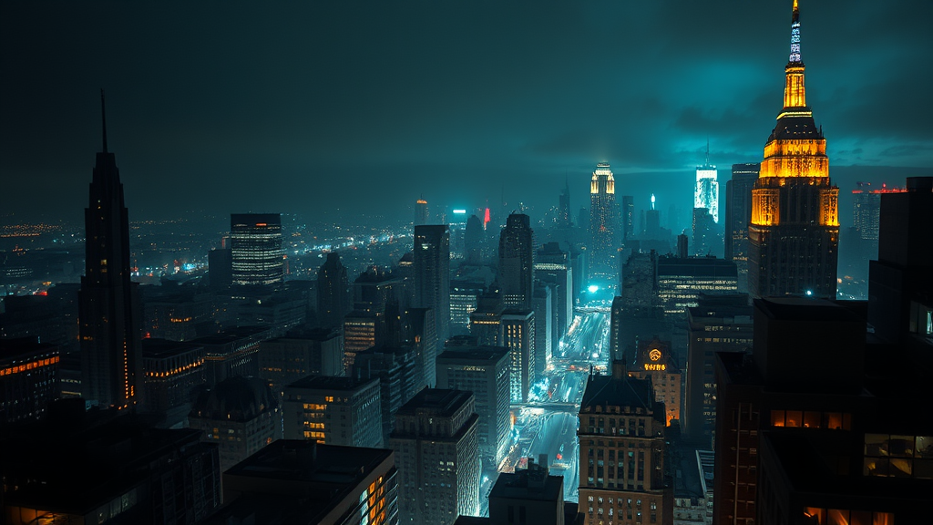 Gotham City skyline at night, cinematic view, ultra-high definition 32k resolution, illuminated with vibrant nightlights, dramatic cinematic lighting and accent lighting, featuring a sense of translucence and glowing luminescence, refined post-production techniques, incredibly detailed and intricate design, hypermaximalist aesthetic, merging elegance with ornate patterns, hyper-realistic portrayal with super detailed architecture and textures, portraying an awe-inspiring, majestic urban landscape --aspect ratio 9:16.