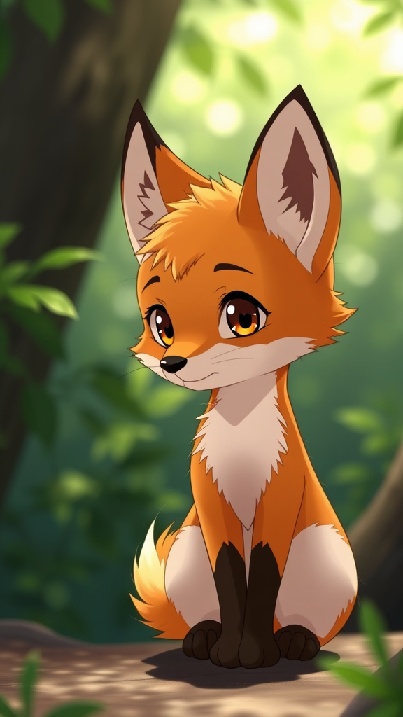 A timid anime fox cub with an orange fluffy tail, exhibiting a cautious demeanor, illustrated in the style of Production I.G. The scene is depicted with earthy tones and rendered using 3ds Max and V-ray, set against a serene, lush green background. The fox's large, expressive eyes and delicate features convey an innocent charm, while subtle dappled sunlight enhances the tranquil forest setting, adding depth and warmth to the composition.