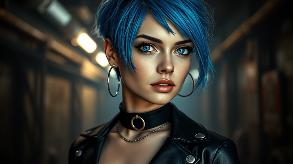 A woman with striking blue, tousled hair and multiple piercings stands against a dim, industrial backdrop. The setting exudes a mysterious ambiance, accentuated by the sharp focus of a Charlie Bowater-inspired character portrait. Her expression is meticulously detailed, with smooth, aesthetic features that are captured in an octane render style. She wears a black choker and large earrings, enhancing her edgy appeal. The woman's piercing blue eyes stand out with realistic texture, giving them a bright, captivating presence. Her lips and nose display subtle piercings, adding to her rebellious charm. She has short hair and dons a rock-inspired outfit consisting of a leather shirt that reveals a hint of a tattoo on her arm. Her pose is elegant, and her dark makeup complements the vivid colors of her appearance. The scene features cinematic lighting, bringing out intricate details of her upper body and facial features, with a beautiful, detailed glow that makes her stand out against the rtx-rendered dark background. The portrait maintains a high-resolution quality with strong, realistic details and a cartoon style edge.