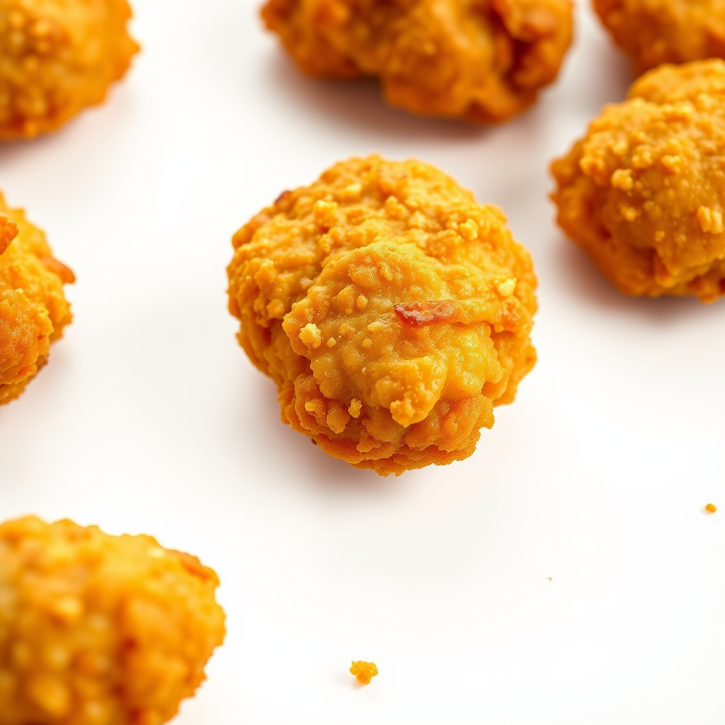 High-resolution commercial photography of golden-brown chicken nuggets, captured with pristine white lighting in a professional studio setting, featuring 8k ultra-realistic octane rendering. The image is characterized by hyperrealism, showcasing finely detailed textures and crisp edges of the nuggets, isolated on a clean white background. Color grading enhances the visual appeal, creating a stock photo quality image designed for professional use. The scene maintains an aspect ratio of 9:16, highlighting each nugget's succulent detail and rich color.