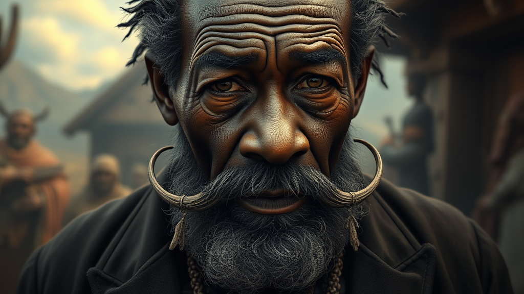 A highly detailed digital art painting depicting a rugged 19th-century African elder with prominent mutton chops, dressed in a vintage Victorian jacket. His weathered face tells stories of a lifetime, showcasing deep lines and a contemplative gaze. The cinematic lighting casts soft shadows, enhancing the intricate textures of his skin. The backdrop hints at a fantasy realm, with subtle, imaginative elements woven into the traditional setting. The scene captures the essence of a worldly sage amidst a historical yet fantastical landscape, reminiscent of the evocative style of Greg Rutkowski.