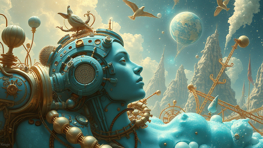 Christiano V-inspired visual fiction, channeling the style of Franciszek Starowieyski with a palette of gold and cyan, creating hyper-realistic sci-fi romantic illustrations. Organic sculpting blends intricately with Android Jones-like elements, weaving a romantic fantasy narrative. A surreal landscape where intricate machinery interlaces with nature, depicting ethereal moments of interstellar romance, bathed in shimmering hues and enveloped in otherworldly beauty.