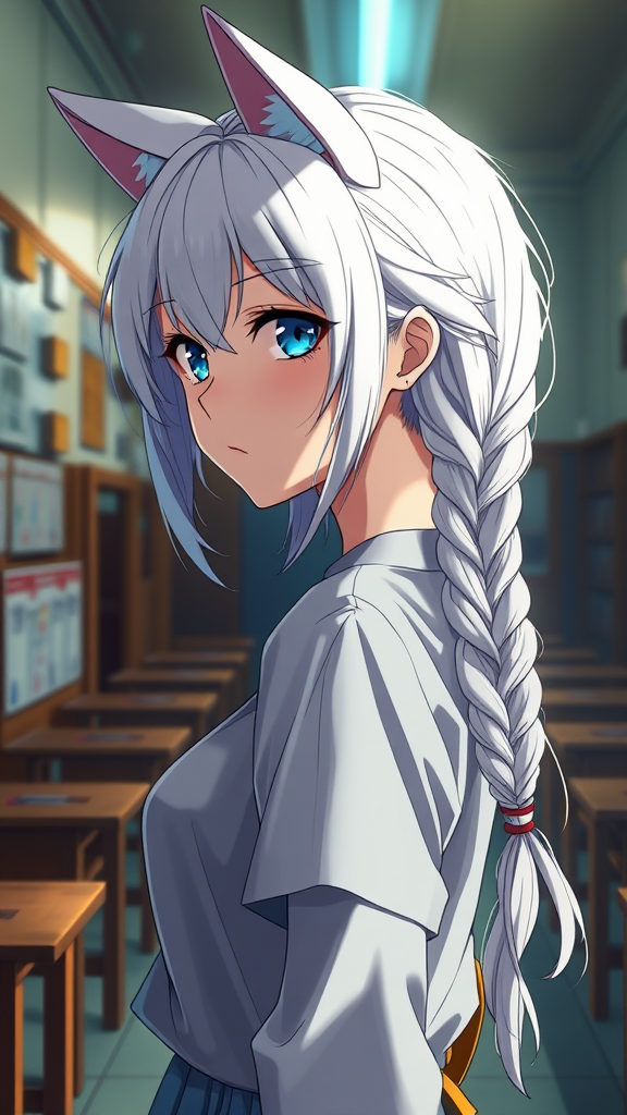 Solo anime girl full body, young adult, medium chest, detailed school background, school setting, intricate white hair braid, cat ears, blue eyes, side profile torso shot, expressive anxious expression, hyperdetailed natural light, vivid reflection and volumetric lighting, maximalist photo illustration in high resolution, vibrant and cinematic with precise lineart, colorful and richly detailed, vintage promotional poster style, fantasy anime art with brush strokes, high-definition photorealistic digital art with glow effects, modeled in 3D and rendered with octane and cinema 4D, atmospheric with sharp focus and deep depth of field, expressive and detailed, inspired by Studio Ghibli and artists like Jeremy Mann and Greg Rutkowski, intricate and high-detail photorealistic painting with vivid colors and a dramatic, cinematic vibe, trending on ArtStation and CGSociety.