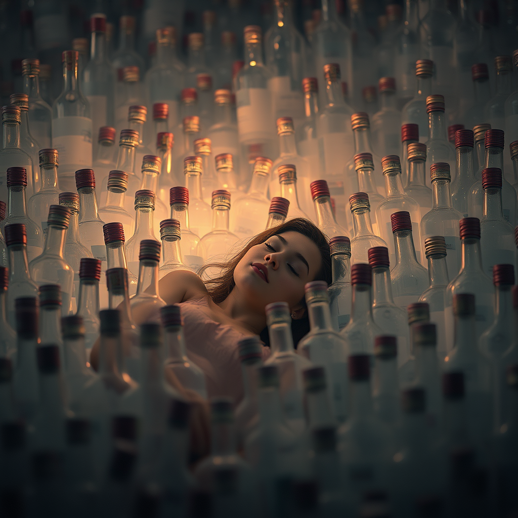 Mystery, dreamy lofi palette, ethereal young woman gracefully nestled amidst an extravagant sea of vodka bottles, evocative of Samdoesarts, leisurely demeanor, vast collection of glass vessels, striking photography, realism, professional 8k resolution, gentle ambient lighting, portrait photography with a touch of magic, dramatic and enchanting lighting, photorealistic, richly detailed, intricate artistry, concept art on Artstation, silky finish, precise focus, ray-traced hyper realism, elaborate nuances, volumetric illumination, cinematic ambiance, photo bashing, epic filmic style, octane-rendered, ultra-high detail, refined post-production, 8K wallpaper quality, subtle film grain, 3D allure, noise reduction, Redshift aesthetics, artful photoshoot, pronounced depth of field, f/1.8 aperture, 85mm lens, medium-frame, volumetric fog drifting, trending on social platforms like Instagram and Tumblr, HDR 4K and 8K quality, highly detailed illustration, exceptional digital art, depth-enhanced.