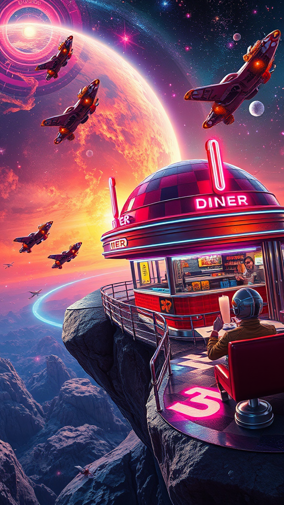 A vibrant retro sci-fi scene depicting a classic 1950s-style diner perched atop an asteroid, surrounded by a celestial panorama filled with swirling nebulas and twinkling stars. Flying cars zip by in a dazzling display of dynamic lights, casting colorful reflections onto the diner’s chrome surfaces and neon signs. Intricate details adorn the diner, from the checkered floors to the red leather booths, while patrons in vintage-style spacesuits sip futuristic milkshakes. The bustling atmosphere is a kaleidoscope of colors, blending seamlessly with the deep void of space, creating a mesmerizing 4K visual experience.