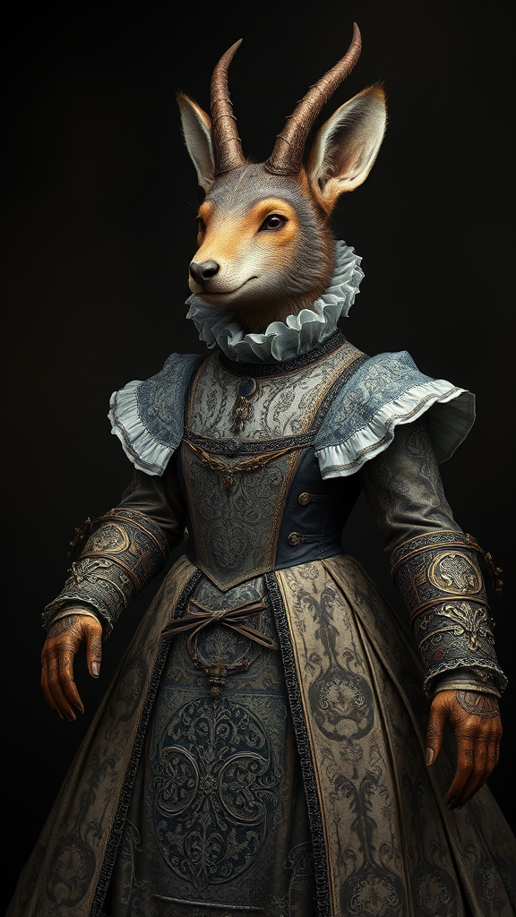 Anthropomorphic animal in an intricately designed medieval gown, inspired by the styles of Peter Morbacher, Anthony Van Dyck, Aleksi Briclot, and Alexandre Cabanel. Set against a dark, gothic background, showcasing an astounding level of detail and artistry. The scene exudes an ethereal and timeless essence, merging classic and fantastical elements into a harmonious concept art piece.