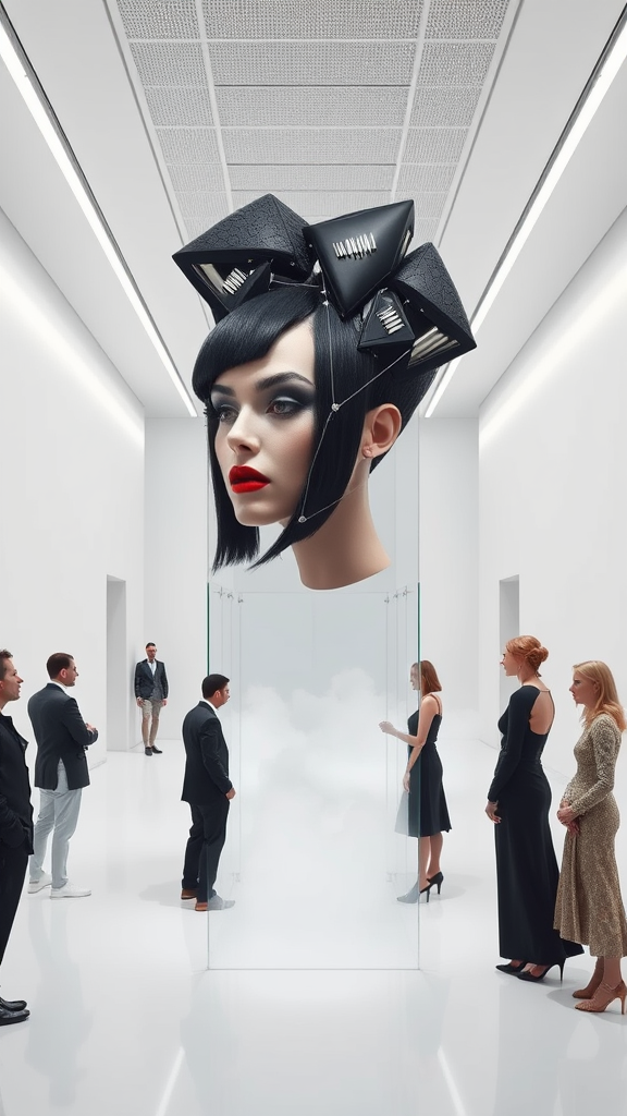 In a futuristic museum hall, a gentle haze of smoke drifts through the air, creating an ethereal ambiance. The entire space, from the pristine white walls to the seamless white floor, overwhelms the senses with its purity, almost disorienting in its clarity. Long, seamless LED strips cover the ceiling, their soft glow diffused by the mist swirling across the floor, casting an otherworldly light throughout the room. With no visible doors or windows, the atmosphere feels surreal and otherworldly. At the heart of this enigmatic space, a minimalist glass display case commands attention. Inside, a mesmerizing, floating female head captivates onlookers, adorned with bold red lips, dramatic editorial makeup, and shimmering metallic highlighter. Her extravagant avant-garde wig features black textured hair with a short fringe, adorned with tiny metallic pins. The hair is sculpted into futuristic, architectural forms and intricate geometric designs, giving the head an appearance of levitation, with no body in sight. Enclosing the display, elegantly dressed men and women admire the sight in their avant-garde, high-fashion futuristic attire, capturing it with their smartphones. Their outfits boast bold, sculptural silhouettes, reflective metallic fabrics, and exaggerated shoulders, complemented by high-neck collars, intricate laser-cut details, and asymmetrical designs. Some wear visor-like glasses, glowing accessories, and garments that defy gravity. The bright flashes of their cameras dance on the glass, creating a mesmerizing play of light. The scene exudes an eerie yet captivating surrealism, blending high fashion, advanced technology, and an air of mystery. The fusion of futuristic aesthetics, editorial styling, and avant-garde fashion elements conjures an image reminiscent of a high-fashion editorial from a far-off future.