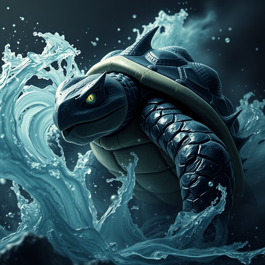 A menacing dark Pokémon Blastoise, a massive monstrous turtle unleashing an overwhelming torrent of water with immense power, its wet and dense form exuding a twisted and macabre aura. The creature's intricate design showcases a horror-inspired elegance, with dramatic lighting that enhances its hyperrealistic features. Every detail is captured in sharp photorealistic clarity, creating a cinematic spectacle in stunning 8k resolution, highlighting the terror and beauty of this unstoppable force.