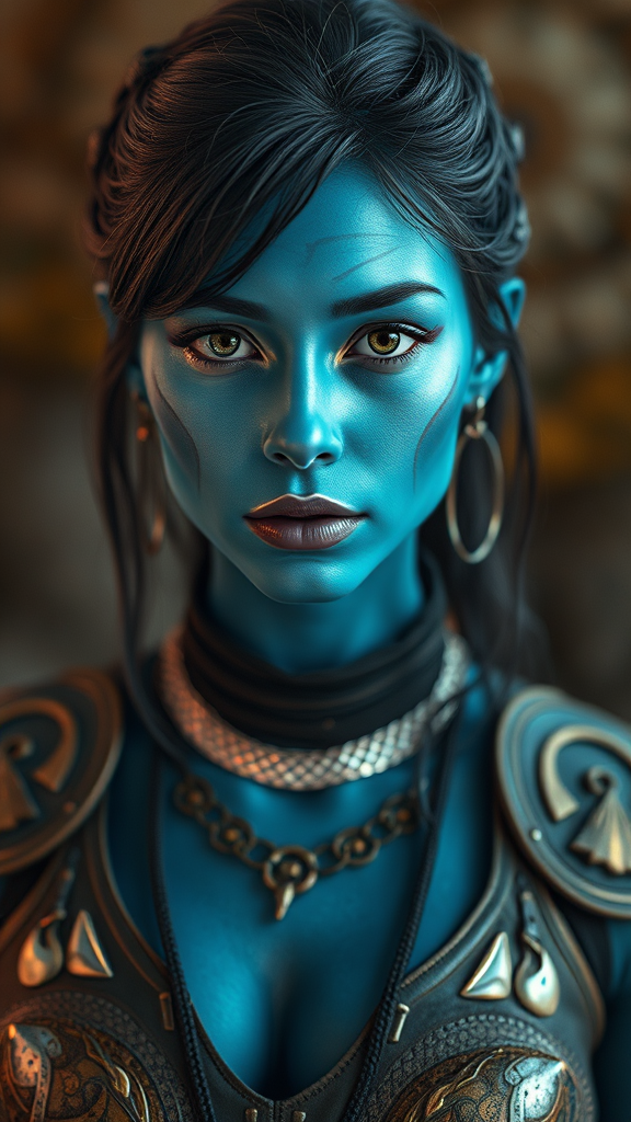 Female dressed as a character from a sci-fi film, features blue skin, adorned in costume, wearing a decorative top, gazing directly at the viewer, portrait-style photography, with intricately detailed skin, rendered in a photo-realistic manner. Captured in a full-length frame with high-definition 8k resolution, featuring high-detail RAW color art, with an added piercing. The image utilizes diffused soft lighting and a shallow depth of field for a sharp focus, achieving a hyperrealistic and cinematic lighting effect. The photograph intentionally excludes low-resolution effects, text errors, and poor quality elements such as jpeg artifacts or duplications. There are no signs of mutation or anatomical distortions like extra limbs or malformed features. Additionally, the image excludes watermarks, usernames, or signatures, and presents a seamless, visually appealing portrait.