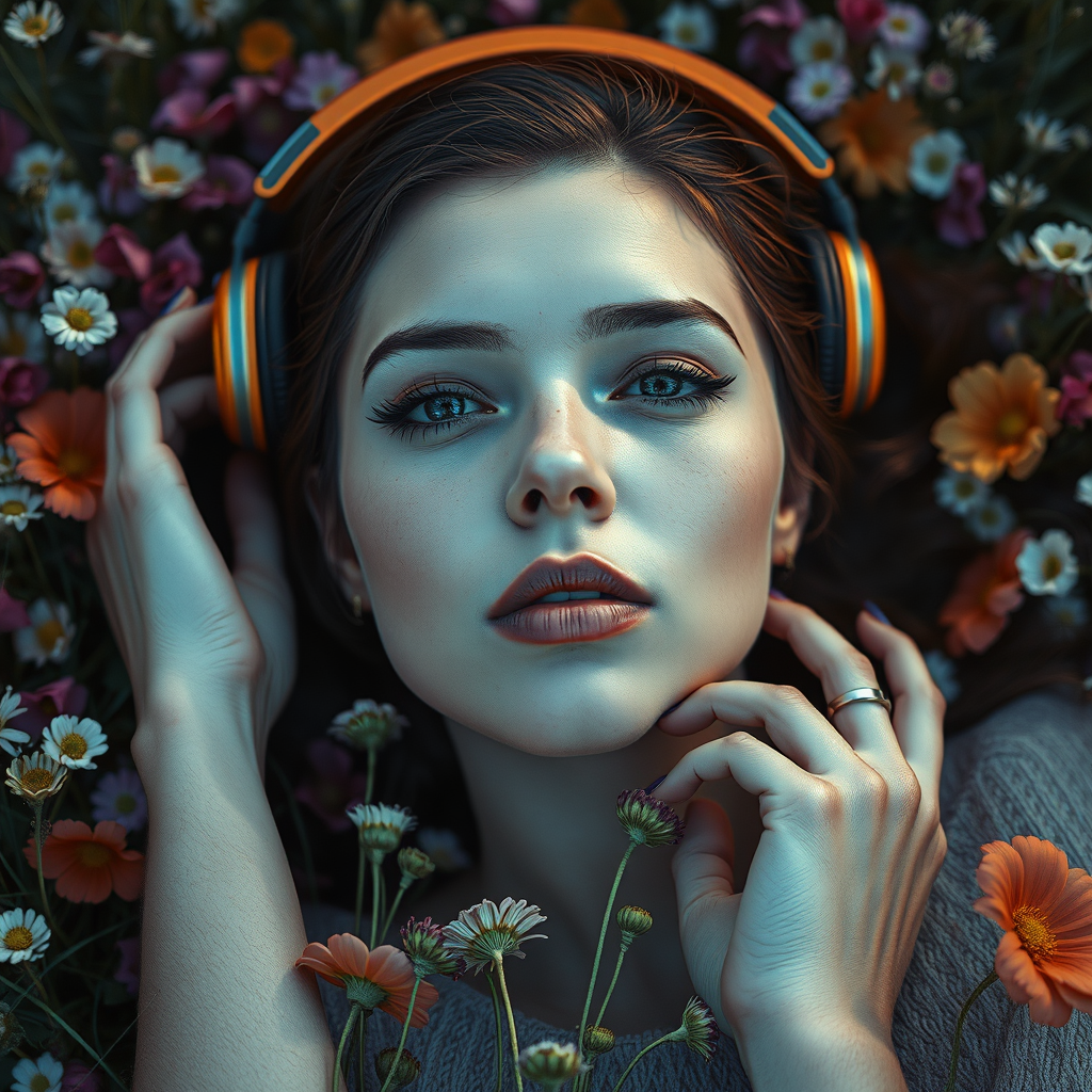 An intricate and cinematic image of a woman lying in a field of flowers, with headphones over her head and a detailed, symmetrical face. The scene is realistic yet captures a dreamlike quality, immersing the viewer in its vibrant colors and textures despite a low resolution. There are subtle hints of digital artifacts and slight imperfections, such as jpeg noise and minor distortions, lending it an unconventional charm. The composition includes unexpected elements like additional limbs and varied digits, creating an abstract, surreal effect. The overall atmosphere is a blend of beauty and oddity, with watermarks adding a layer of complexity to the artwork.