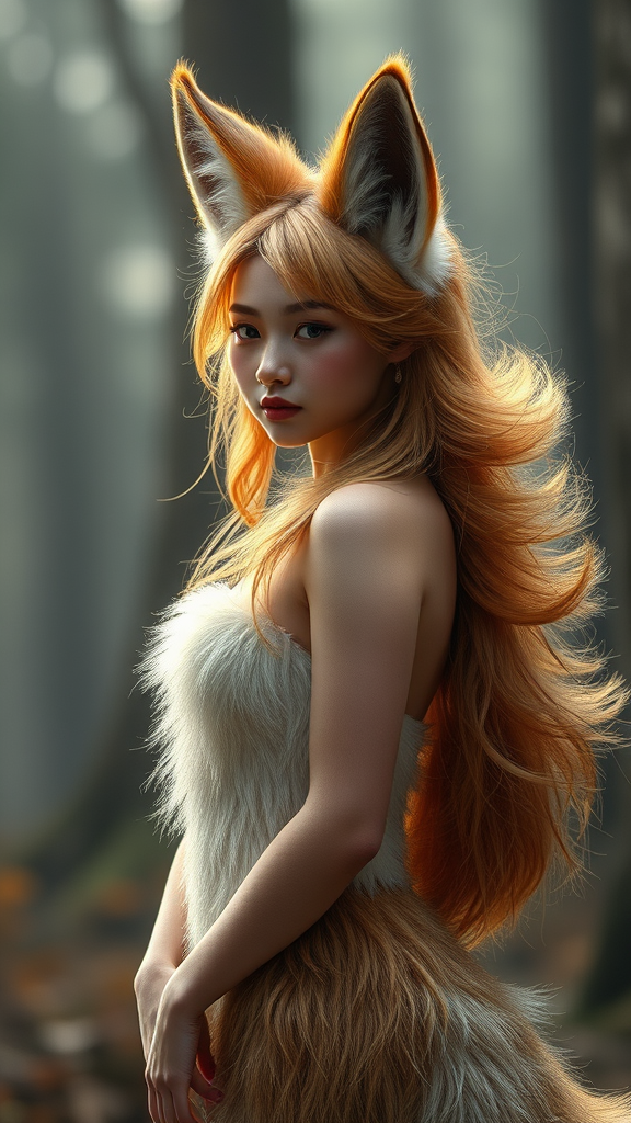 A hyper-realistic, professional 8k photograph captures a mythical nine-tailed fox girl inspired by the works of Wlop and Guweiz. She stands gracefully, her fur shimmering with a soft, natural glow. The serene expression on her face is contrasted by the whimsical flutter of her fluffy tails, each one rich in texture and detail. Natural, ambient lighting highlights her ethereal features, bringing a sense of life and vibrancy to the scene. Her ears perk slightly, listening, as if caught in a moment of wonder. The background is a blurred forest landscape, muted and dreamy, enhancing her otherworldly presence and reinforcing the magical realism of the setting.
